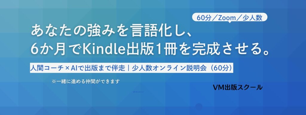 VM出版スクールは、人間コーチ×AIでKindle出版(電子書籍出版)を完成まで伴走します。