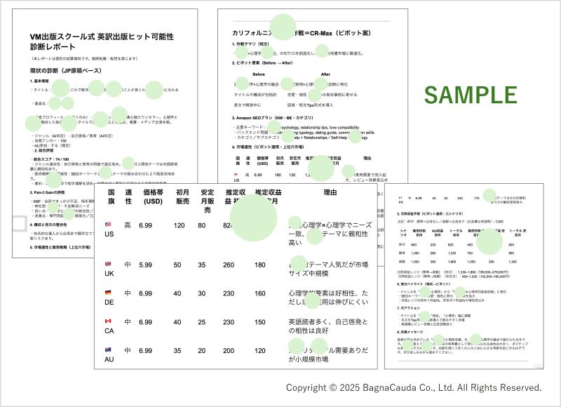 VM出版スクールでは、kindle出版本を英訳して主に英語圏で展開する「POWER ENGLISH」プロジェクトを実施しています。スクール代表の古川&スクールの知見をもとに、独自のAI分析プログラムを開発。「あなたの著書が海外でどのくらいヒットする可能性があるか?」をAIで分析・予想する「ヒット診断レポート」をチラッとお見せします。